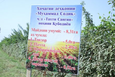 Иттилоъ дода шуд, ки хоҷагии мазкур дорои 12 гектар замини корами обӣ буда, дар майдони 6,5 гектари он пахта кишт намуда, айни ҳол нашъунамои хуб дорад. Хоҷагидорон аллакай коркарди байниқаторҳо, обмонӣ ва ғизои якумро бо пуррагӣ дар доираи қоидаҳон агротехникӣ амалӣ намудаанд.