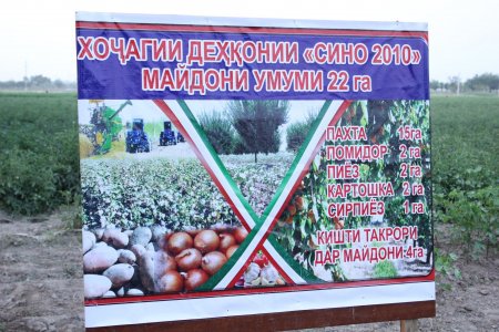Иттилоъ дода шуд, ки майдони умумии хоҷагӣ 20 гектар замин буда, дар 14 гектар пахта, 2 гектар помидор, 1 гектар сирпиёз кишт намуда, дар 3 гектар кишти такрорӣ гузаронидааст.