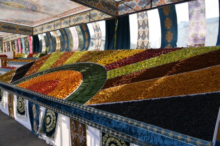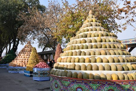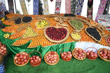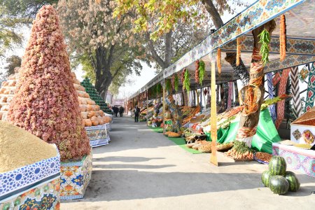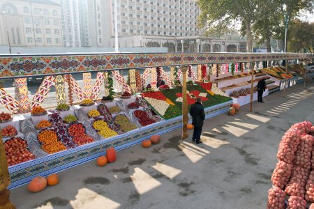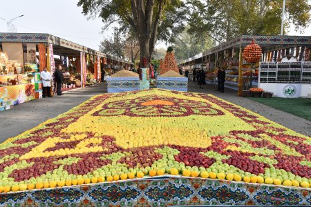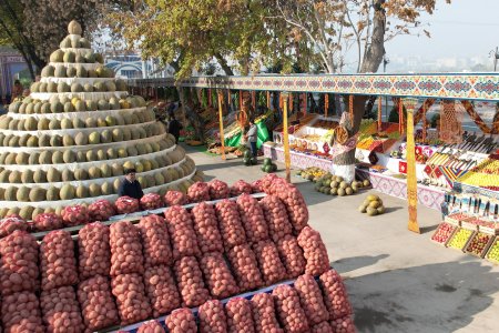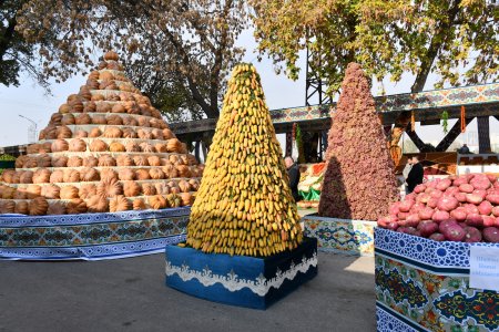 Меваҷот, сабзавот, ғалладонагӣ, биринҷ, хушкмева, асал ва дигар навъу намунаҳои маҳсулоти кишоварзиро заҳматкашони шаҳру ноҳияҳои вилояти Суғд ба таври пирамида ва тасвирҳои гуногун ба намоиш гузоштанд, ки собитгари фаровонии ҳосил дар соли 2024 мебошад.